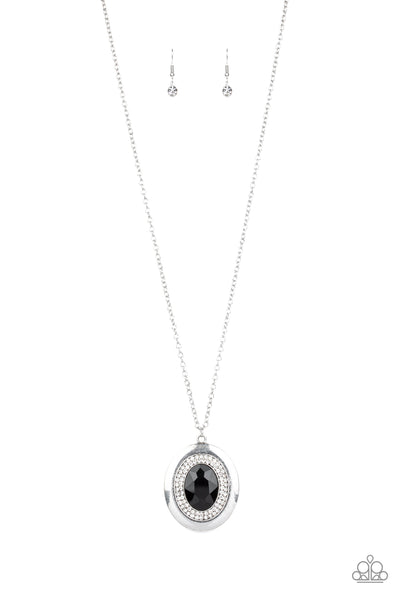 Encircled in rings of glassy white rhinestones, an oversized black gem is pressed into the center of a glistening silver frame, creating a glamorous pendant at the bottom of a lengthened silver chain. Features an adjustable clasp closure.
