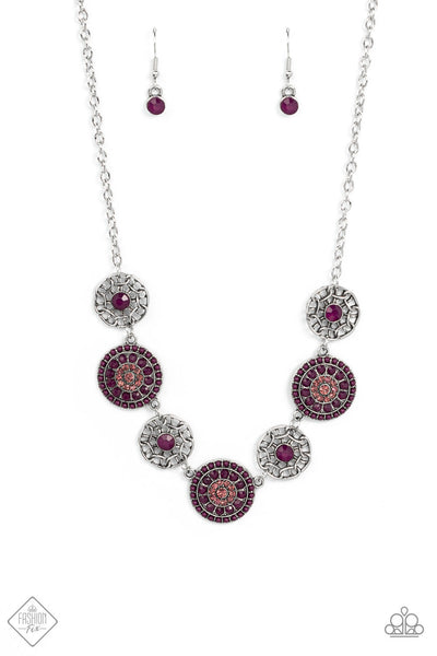 Bursts of faceted plum beads and sparkling light amethyst rhinestones radiate from the centers of antiqued silver frames, while smaller airy frames are dotted with plum centers. The whimsical designs alternate around the collar making a dazzling display. Features an adjustable clasp closure.