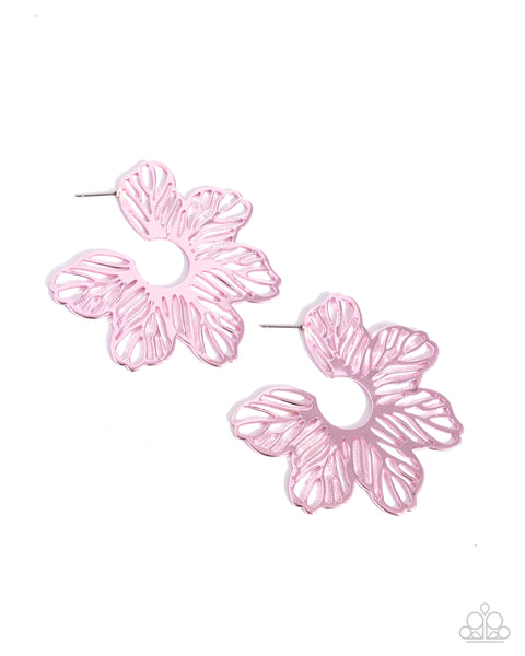 Airy, high-sheen metallic pink flowers bloom and flare around the ear for a whimsical display. Earring attaches to a standard post fitting. Hoop measures approximately 2 1/4" in diameter.
