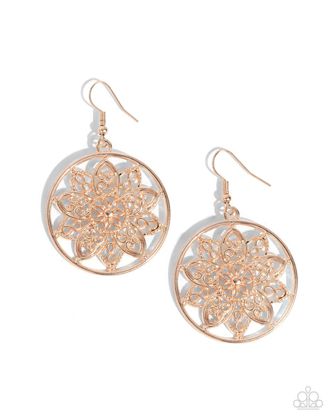 Enhanced with rose gold infinity accents, filigree-filled petals bloom into a mandala inspired flower inside of a rose gold hoop for a seasonal floral fashion. Earring attaches to a standard fishhook fitting.