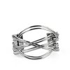 Brushed in an antiqued shimmer, hammered out pieces of flat gunmetal bars decoratively weave into a curved cuff around the wrist for an intense industrial finish.