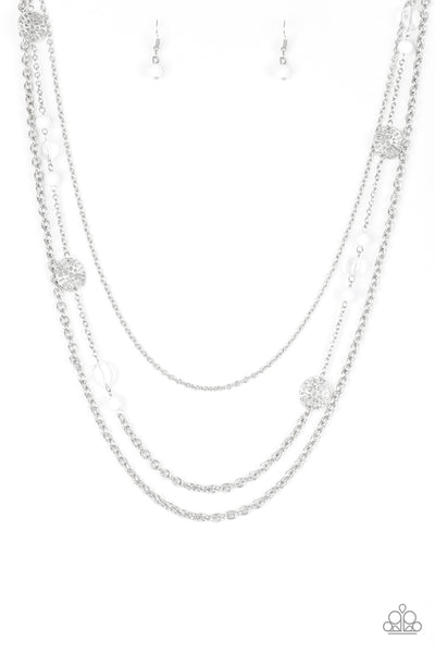 Ornate silver accents, glassy beads, and polished white beads trickle along strands of shimmery silver chains for a whimsical look. Features an adjustable clasp closure.