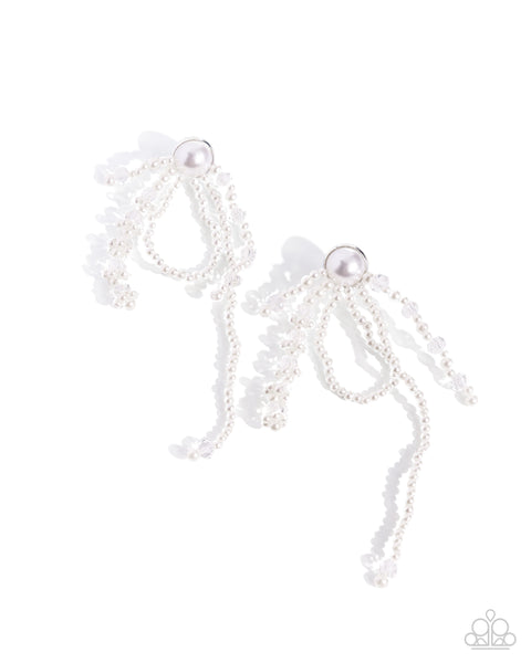 Cascading from an oversized white pearl post, a collection of dainty white pearly strands with faceted clear beads sporadically interspersed creates a dramatically decadent display along the ear. Earring attaches to a standard post fitting.