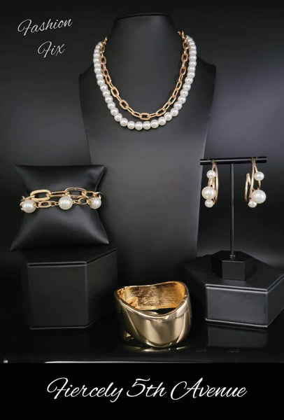 A string of classic white pearls is layered with a strand of oversized gold links, creating a gorgeous collision of refinement and grit as they lay along the collar. Features an adjustable clasp closure.