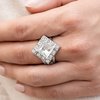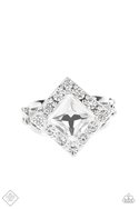 An oversized, square-cut, white rhinestone is tilted on a point and framed by tiny white gems. As it sits atop a pair of sleek silver bands, the faceted surface of the centerpiece catches and reflects the light of the accents that surround it, magnifying its impressive impact. Features a dainty stretchy band for a flexible fit.