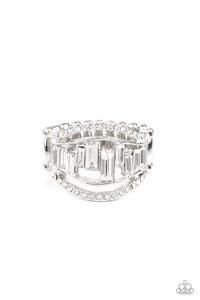 White rhinestone encrusted bands flank a row of emerald cut glass beads in shades of white for a regal look. Features a stretchy band for a flexible fit.